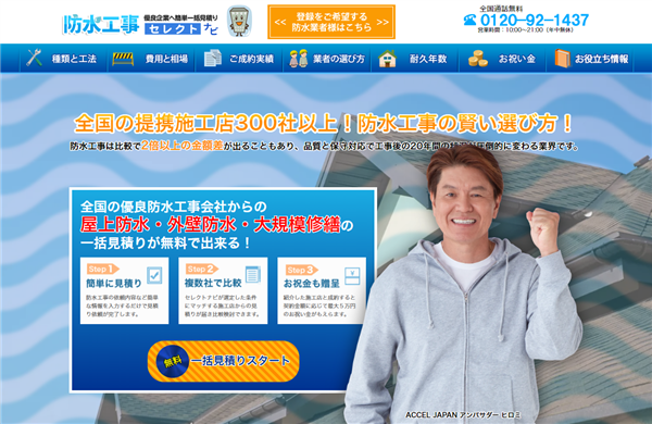 「防水セレクトナビ」には300社以上の防水工事業者が加盟しており、その中から3〜5社を紹介してくれます。